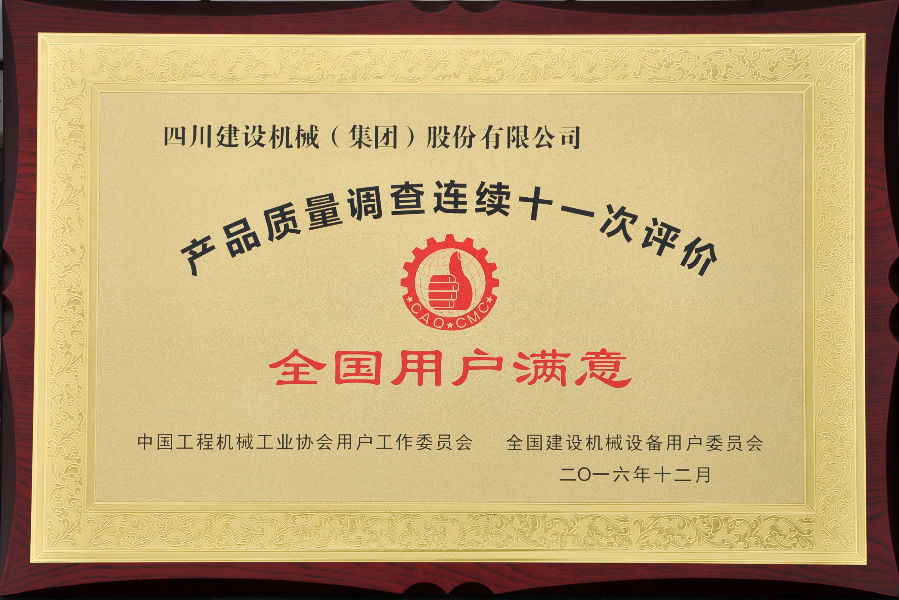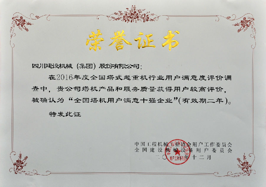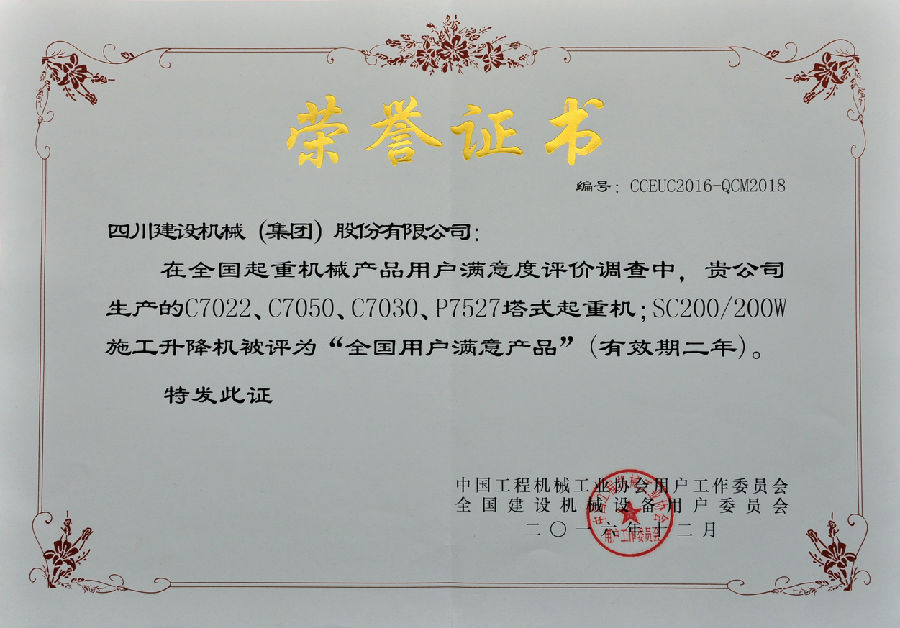 2016年全國用戶滿意產(chǎn)品評價測評結(jié)果公布,四川建設(shè)機械(集團(tuán))股份有限公司憑借良好的產(chǎn)品和服務(wù)質(zhì)量獲得全國用戶的較高評價,榮獲了“全國塔機用戶滿意十強”企業(yè);獲得產(chǎn)品質(zhì)量調(diào)查連續(xù)十一次評價“全國用戶滿意”企業(yè);公司生產(chǎn)的C7022、C7050、C7030、P7527塔式起重機以及SC200/200W施工升降機被評為“全國用戶滿意產(chǎn)品”;同時獲得“用戶滿意服務(wù)”獎;1989年至今川建已連續(xù)十一次獲得全國用戶滿意獎,得到了業(yè)內(nèi)用戶的高度認(rèn)可。