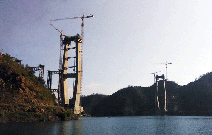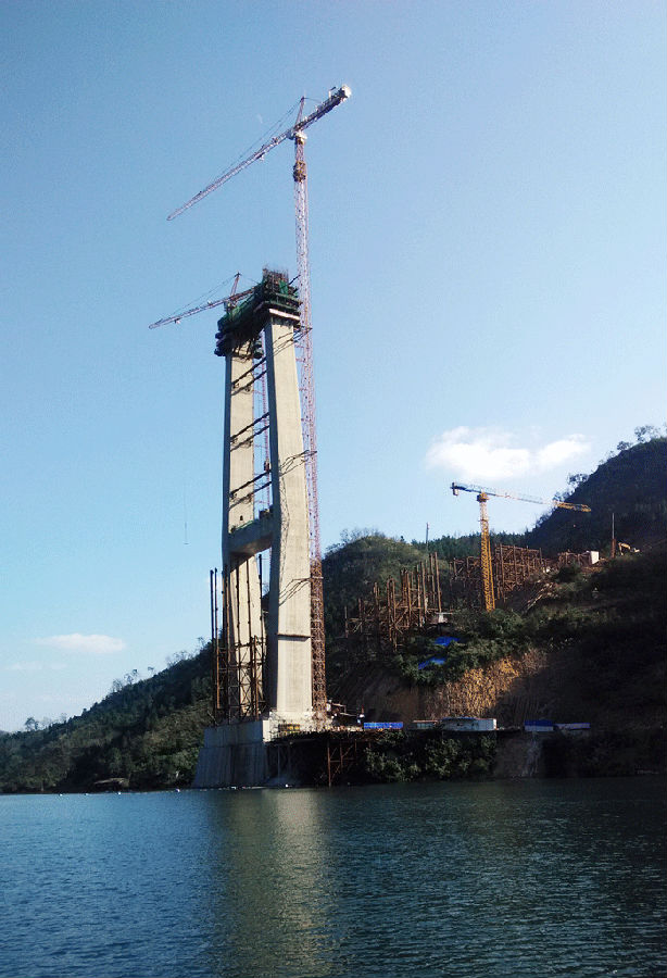 紅水河特大橋橋長956米,引橋設(shè)計(jì)為2×20米預(yù)應(yīng)力混凝土現(xiàn)澆箱梁,主橋設(shè)計(jì)為貴州岸邊跨213米,主跨508米,廣西岸邊跨185米的雙塔雙索面混合式疊合梁斜拉橋,結(jié)構(gòu)設(shè)計(jì)形式新穎。橋面寬27.7m,為雙向四車道高速公路。設(shè)計(jì)速度每小時(shí)80公里,總投資5.46億元,由廣西路橋公司承建。大橋在施工中利用斜拉橋主塔本身安裝纜索吊裝系統(tǒng),以纜索吊裝鋼主梁及疊合預(yù)制橋面板作為一種拉索體系,使橋梁受力更加合理化,施工更加便捷,相比傳統(tǒng)梁式橋、拱橋具有更大的跨越能力