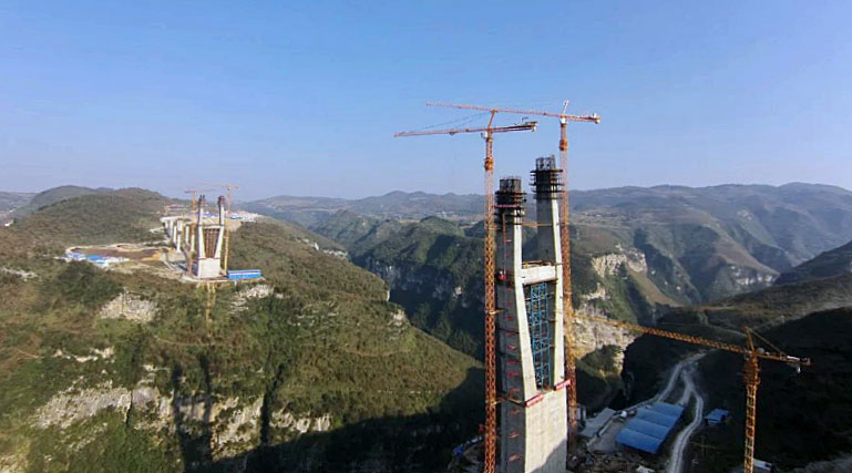 六廣河特大橋是整條高速公路最為重要,同時也是施工難度最大的控制性工程,兩側(cè)橋墩高度均為242米,每個橋墩的起重機械配置均為川建生產(chǎn)的兩臺C7030塔機和兩臺SC200/200WPZ中速變頻施工梯。