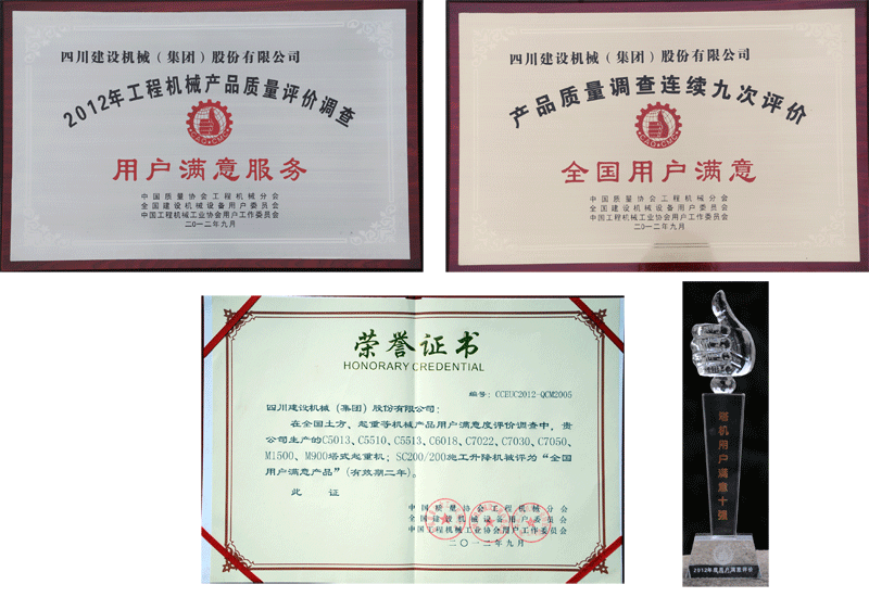 會議上,侯寶佳秘書長公布了用戶滿意產(chǎn)品、滿意服務(wù)企業(yè)及塔機(jī)用戶滿意十強(qiáng)等評選名單,對到會的企業(yè)代表及個(gè)人進(jìn)行了現(xiàn)場表彰,并對連續(xù)三次以上獲得用戶滿意產(chǎn)品稱號的企業(yè)進(jìn)行表彰。四川建設(shè)機(jī)械(集團(tuán))股份有限公司在2012年工程機(jī)械產(chǎn)品質(zhì)量評價(jià)調(diào)查中獲得“用戶滿意服務(wù)”,迄今為止已經(jīng)是(集團(tuán))公司產(chǎn)品“質(zhì)量調(diào)查連續(xù)九次評價(jià)全國用戶滿意”。公司生產(chǎn)的C5013、C5510、C5513、C6018、C7022、C7030、C7050、M900、M1500塔式起重機(jī)以及SC200/200施工升降機(jī)被評為“全國用戶滿意產(chǎn)品”。同時(shí),協(xié)會在用戶滿意產(chǎn)品的基礎(chǔ)上評選出2012年塔式起重機(jī)行業(yè)“全國塔機(jī)用戶滿意十強(qiáng)”企業(yè),包括四川建設(shè)機(jī)械(集團(tuán))股份有限公司、撫順永茂建筑機(jī)械有限公司、中聯(lián)重科股份有限公司、廣西建工集團(tuán)建筑機(jī)械制造有限責(zé)任公司、北京永茂建工機(jī)械制造有限公司、沈陽三洋建筑機(jī)械有限公司、浙江省建設(shè)機(jī)械集團(tuán)有限公司、湖北江漢建筑工程機(jī)械有限公司、浙江虎霸建設(shè)機(jī)械有限公司、江蘇正興建設(shè)機(jī)械有限公司。